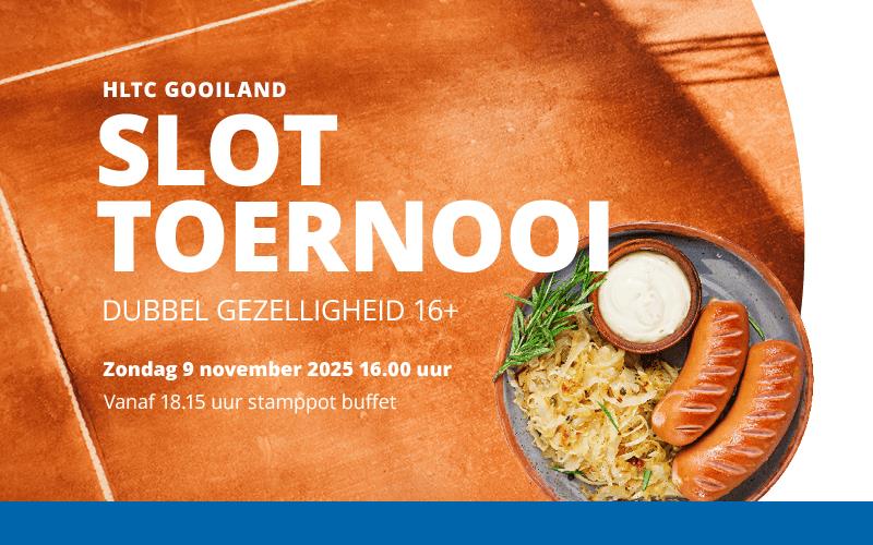 Op zondag 9 november sluiten we het seizoen af met het Slottoernooi. Dit dubbeltoernooi is voor leden vanaf 16 jaar en na afloop eten we samen de heerlijke stamppot van Roland. Uiteraard kan familie aanschuiven bij het stampotbuffet. Op het inschrijfformulier kan je aangeven met hoeveel personen je komt.